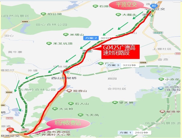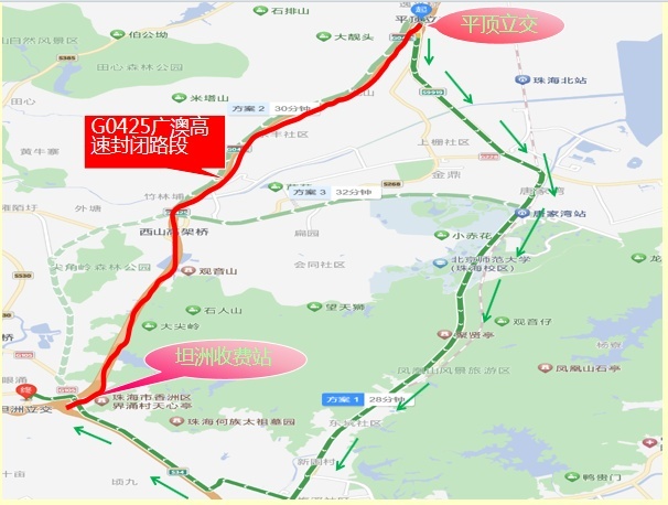 S9919广澳高速珠海支线→港湾大道→金凤路→梅界中路→香洲大道→坦洲收费站入口。