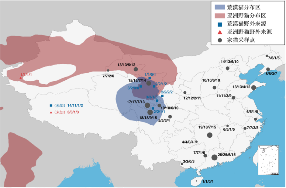 最后,我们跑遍了全国的十几个省份,收集了100多个中国本地土猫和野猫的样品。图里面的红色和蓝色展示出的就是中国有野猫分布的地方。我们在这些有野猫分布的地方采集了土猫的标本,也在没有野猫的地方收集了大量的样本进行研究。