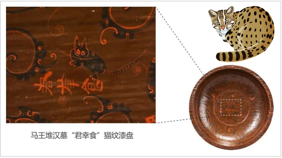 豹猫和家猫外形上有一个非常明显的区别,就是豹猫身上有像豹子一样的斑点。在观察到这个现象之后,我们再回过头去看马王堆汉墓里面出土的漆盘,就会发现那只小猫的身上也有很多斑点,而不是家猫里面常见的条纹的。