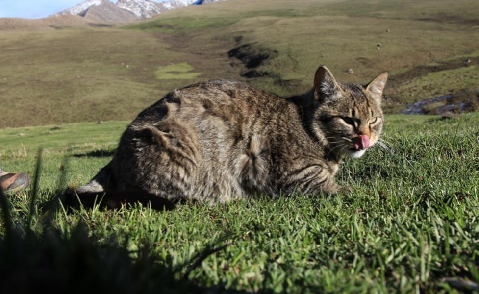 下面的照片展示了一只在青海的草原上找到的、有荒漠猫血统的家猫。它看起来可能和我们身边的家猫没有很明显的区别,但其实还是有点野性的,要抓这只小猫非常不容易。