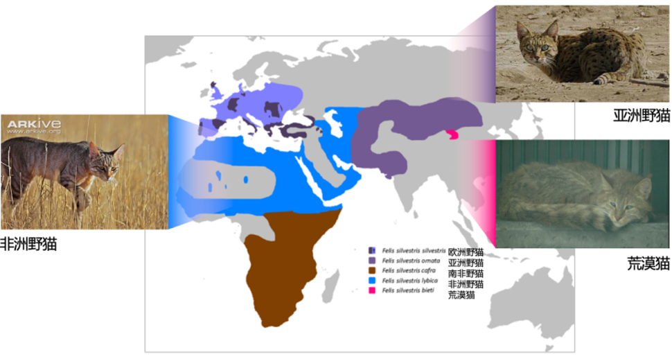关于这个讨论,我先给大家介绍一点背景。在这之前,已经有国际上的科学家对猫的驯化和起源问题开展了一些研究工作。他们发现全世界的猫都是从分布在北非和西亚的非洲野猫驯化而来的。但是很遗憾,他们的研究并没能够覆盖到中国的猫。