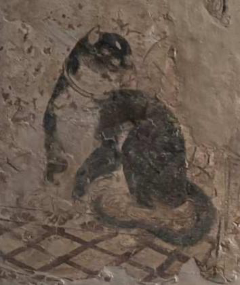 根据赵瑶瑶的研究,她发现关于最早的家猫,可靠的文献记录以及图像也出现在唐代。下图是在唐代一个墓穴里面发现的壁画。这幅画是一只黑白花的猫,这种颜色是在野猫中不会出现的,显然它是一只家猫。