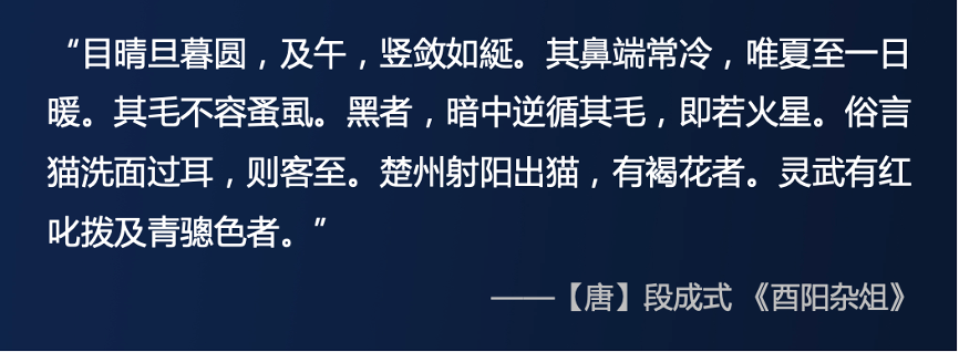 同样,在唐代段成式《酉阳杂俎》的一段记录中也展现出了明显是来自家猫的一些行为和外形特征。比如他说猫的鼻端常冷,经常是湿湿凉凉的,家里有养猫的同学肯定深有体会。另外他还提到猫有褐花的,也有红色以及青色的,这些都是在野猫中不太可能出现的外形,都是家猫才会出现的丰富毛色。