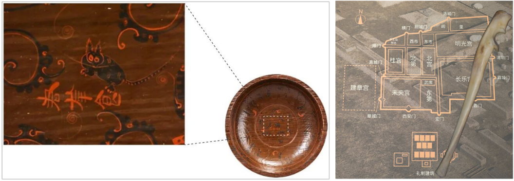 左:马王堆汉墓“君幸食”猫纹漆盘 右:家猫尺骨标本及汉长安城平面图