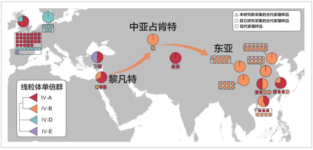 再往远了说,它们也和西亚地方、黎凡特地区的猫非常相似。如果我们将这几个点连起来的话,就可以看到猫传到中国的通道,可能是经由丝绸之路来到了中国,只不过它到达中国的时间并不像我们以前认为的汉代,而是晚到了唐代。