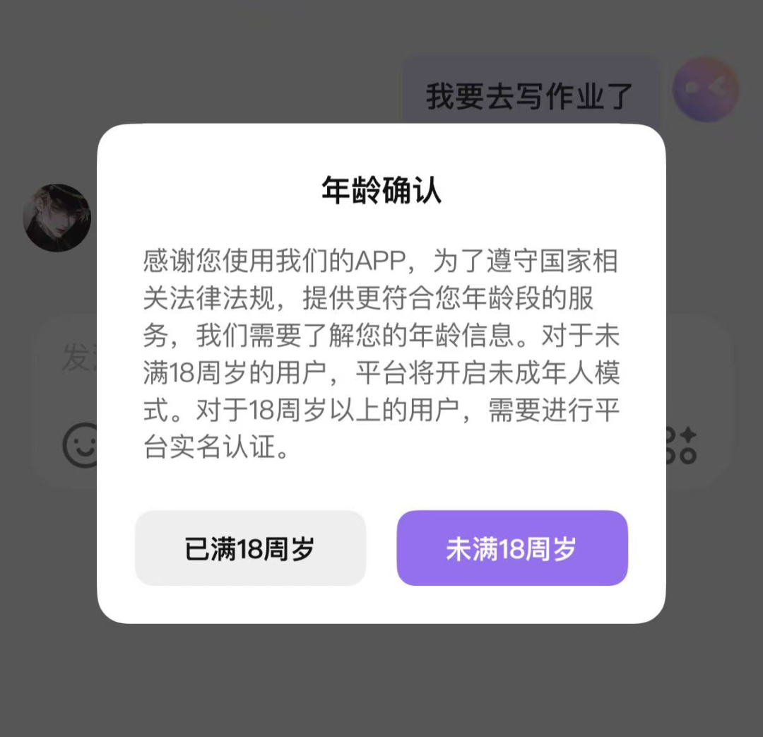 平台检测到用户可能是未成年人后,弹出“年龄确认”页面。