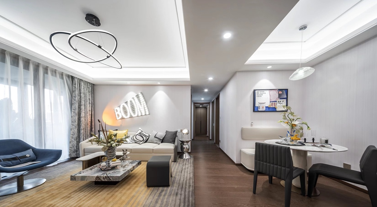 在室外的颜值打造上,外立面首当其冲,铝板一体板+大面积中空玻璃+少量真石漆搭配出的公建化外立面,简约的线条灵动的勾勒出建筑的品质感,大面积的高窗墙比,美观的同时让阳光与清风也能更多涌入室内。