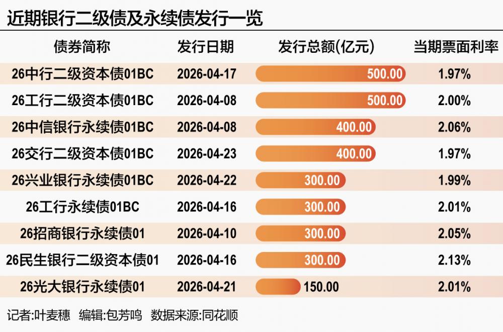 根据中国货币网披露的债券发行数据,今年一季度,商业银行并未发行二级资本债与永续债,直到4月10日,工商银行披露完成500亿元二级资本债发行,票面利率为2.00%,为2026年国内商业银行首单二级资本债;同日,中信银行宣布完成400亿元永续债发行,前5年票面利率为2.06%,这亦是年内首单银行永续债。仅10天后,工商银行再度发力,于4月20日表示完成300亿元永续债发行,至此其年内发行债券规模已达800亿元。